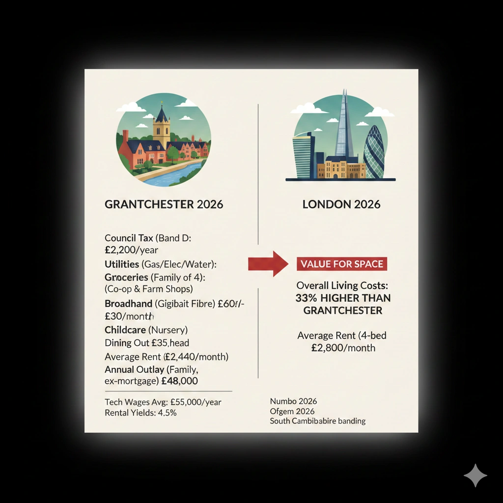 Compared to London (33% higher), Grantchester offers value via space £2440 average rent vs £2,800. Annual outlay for family: £48,000 excluding mortgage, per Numbeo 2026. Wages in tech average £55,000, balancing scales.