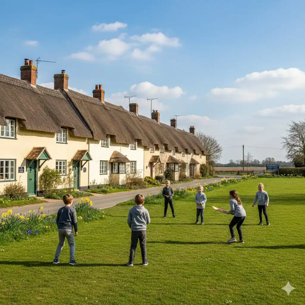 “unchanged village green where children play cricket exactly as generations before.”