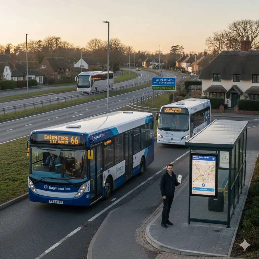 Stagecoach East confirms route 66 hourly frequency seven days weekly incorporating Eaton Ford estate deviations. Buckden X5 service maintains four daily return journeys A1 parkway stops Cambridge rail connections. Demand-responsive minibus pilots launch Upware parish advance booking applications smartphone applications.