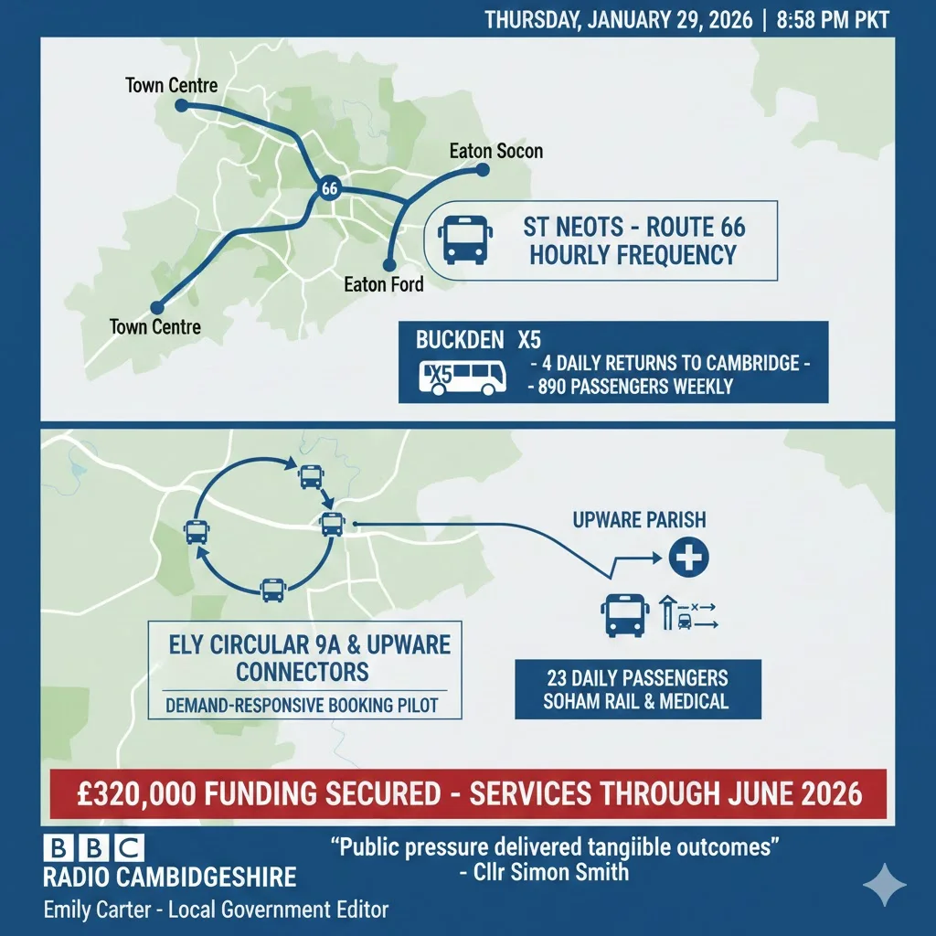 Cambridgeshire (Cambridge Tribune) 29 January 2026 –Cambridgeshire and Peterborough Combined Authority announced Thursday reversal of planned bus service cuts affecting St Neots, Buckden, Ely, and Upware routes following member interventions. Mayor Paul Bristow confirmed three services receive £320,000 emergency subsidy extension preserving 3,400 weekly passengers. Decision follows 2,800 public consultation responses prioritising rural connectivity over financial pressures.