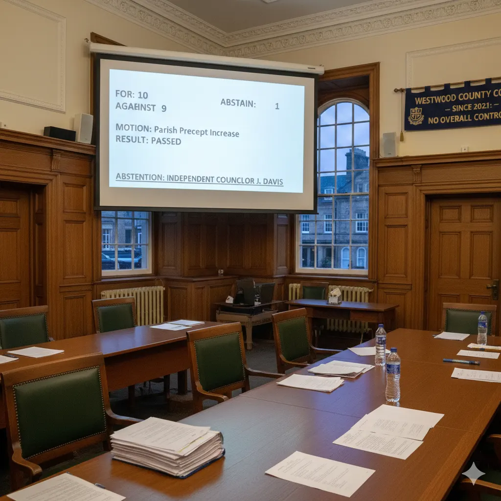 One abstention came from an independent councillor citing unresolved queries on parish precept impacts. The narrow margin underscores the council’s hung status, with no overall control since 2021 elections.