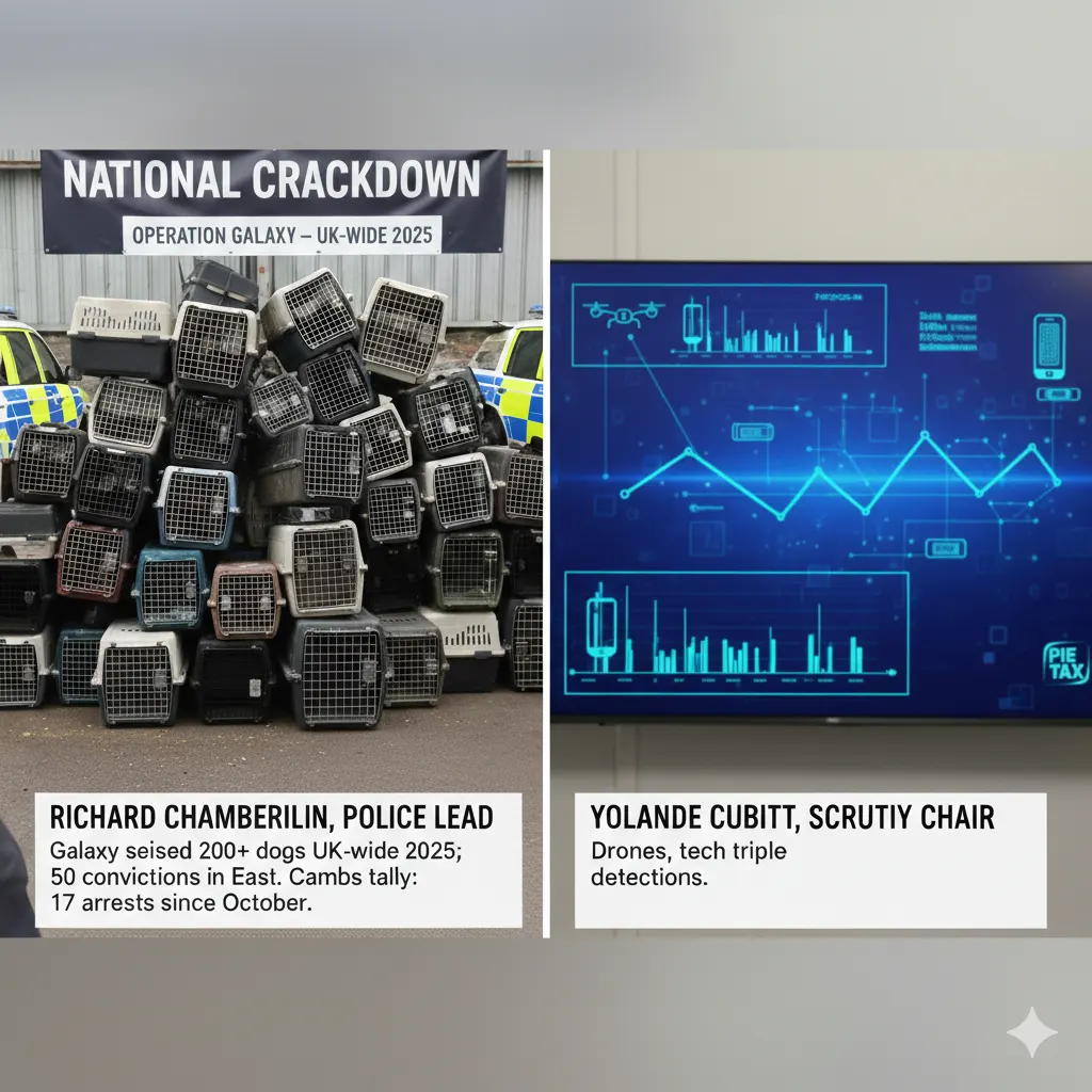 National crackdown. Richard Chamberlain, police lead, told Cambs Times: “Galaxy seized 200+ dogs UK-wide 2025; 50 convictions in East.” Cambs tally: 17 arrests since October.