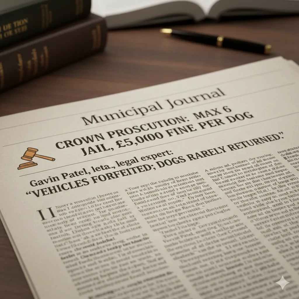 Crown Prosecution max: 6 months jail, £5,000 fine per dog. Gavin Patel, legal expert in Municipal Journal: “Vehicles forfeited; dogs rarely returned.”