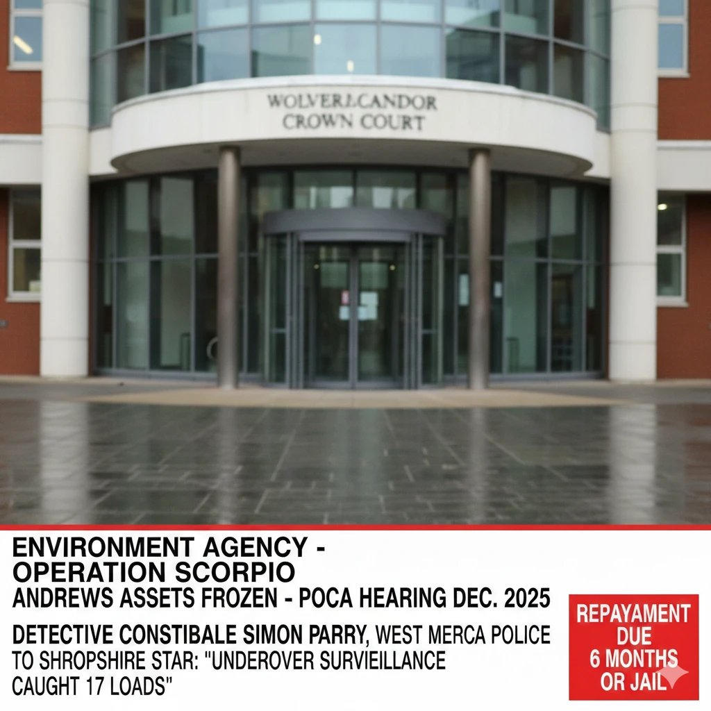 Environment Agency launched Operation Scorpio in 2021, using CCTV, drones, and tipster lines. Andrews arrested July 2023 at Wolverhampton depot. As reported by detective constable Simon Parry of West Mercia Police to the Shropshire Star: “Undercover surveillance caught 17 loads.”