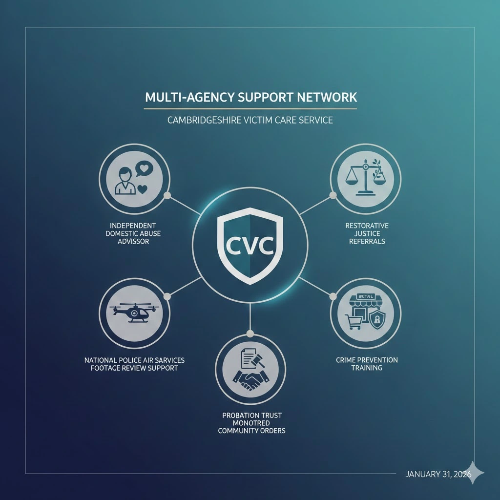 Cambridgeshire Victim Care Service assigned independent domestic abuse advisors. Restorative justice referrals offered where appropriate. Probation trust monitored community orders where applicable.