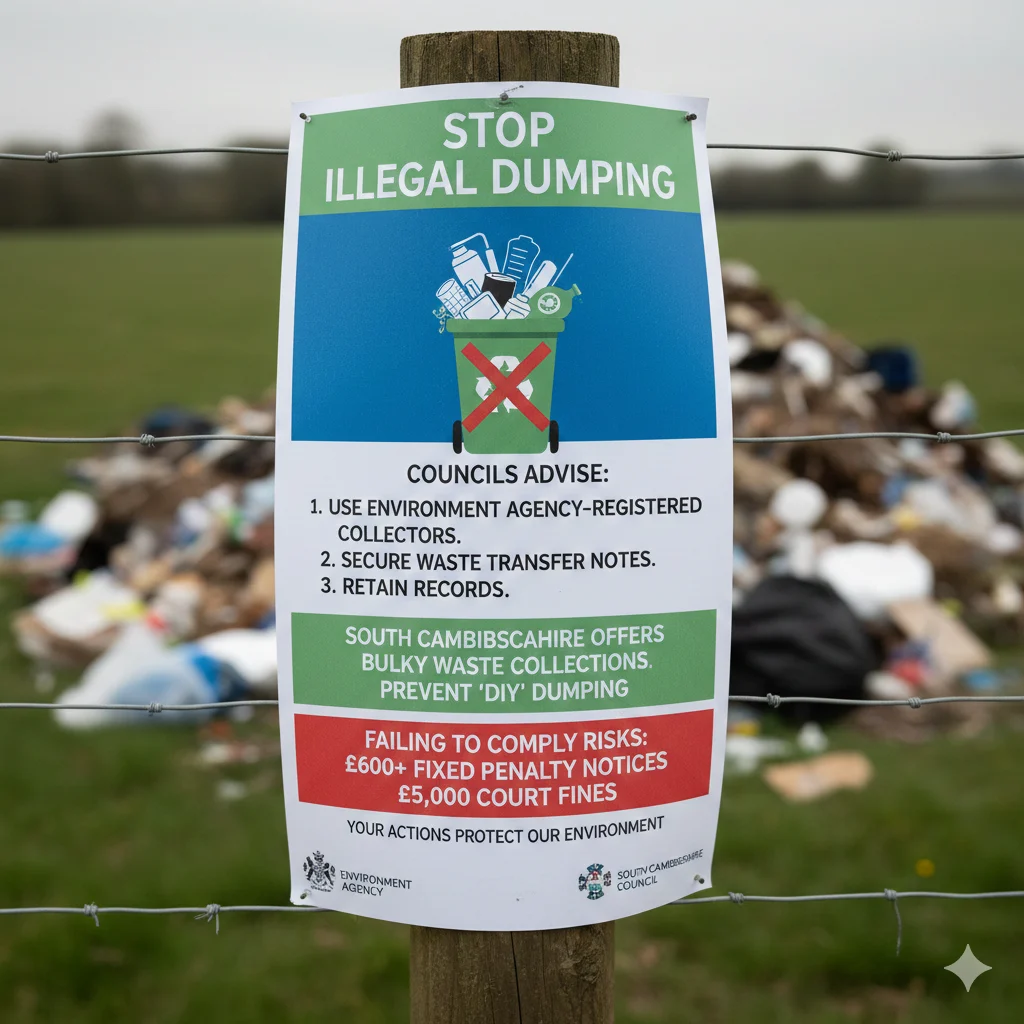 Councils stress using Environment Agency-registered collectors, securing waste transfer notes, and keeping records. South Cambridgeshire offers bulky waste collections to prevent DIY dumping. Failing this risks £600+ Fixed Penalty Notices or £5,000 court fines.