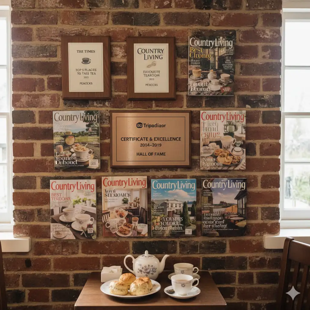 Peacocks’ reputation is underpinned by a long run of formal accolades from industry bodies and national publications. TeaTime Magazine records that in 2007 the UK Tea Council’s Tea Guild named Peacocks the UK Top Tearoom, and that it went on to receive Awards of Excellence in all subsequent annual awards run by the guild.