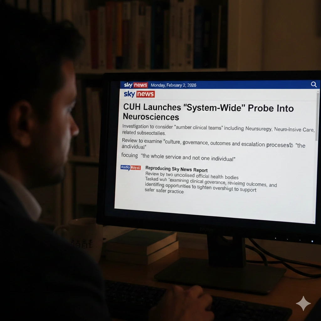 As reported by Sky News, CUH has stated that the investigation will consider “a number of clinical teams” within neurosciences, which typically includes neurosurgery, neurology, neuro‑intensive care and related subspecialties that manage complex brain injuries and head trauma. Sky News said it is “understood the review will look at the whole service and not one individual”, indicating a broad, system‑wide focus on culture, governance, outcomes and escalation processes.