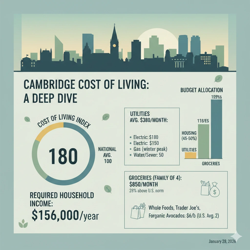 Cambridge’s cost-of-living index registers 180 versus the national 100, necessitating a $156,000 household income to maintain equivalent purchasing power—roughly three times median rent payments. Housing dominates at 45-50% of budgets, followed by utilities averaging $380 monthly (electric $180, gas $150 winter peaks, water/sewer $50). Groceries for a family of four total $850 monthly, 28% above U.S. norms due to prevalence of Whole Foods, Trader Joe’s, and farmers’ markets emphasizing organic produce at $6/lb avocados versus $2 national.