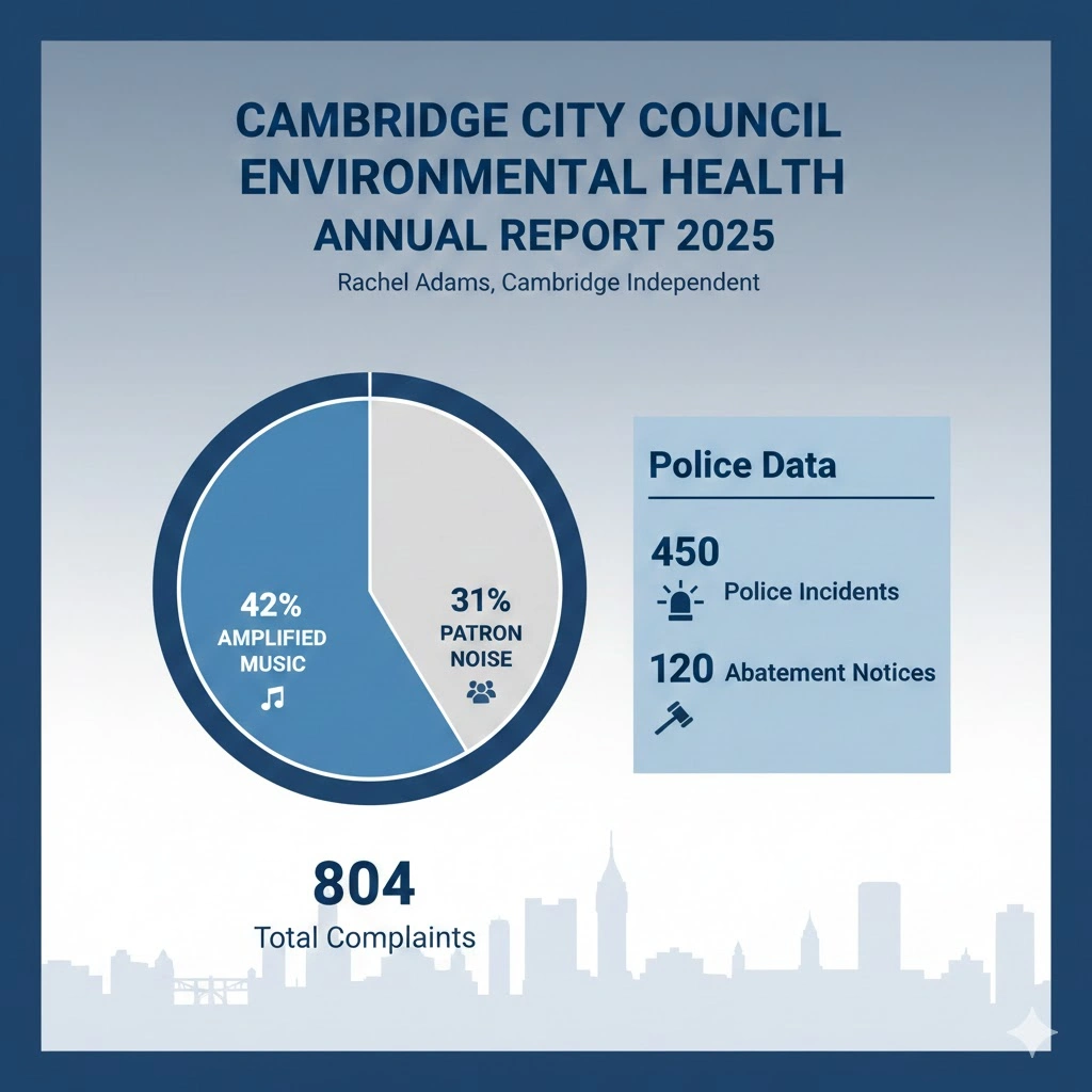 Cambridge City Council’s Environmental Health team logged 804 complaints linked to licensed premises in 2025. As documented by Rachel Adams of Cambridge Independent, 42 per cent complaints involved amplified music escaping venues while 31 per cent cited patron noise on streets post-closing. Police data confirms 450 incidents required attendance with 120 premises receiving abatement notices.