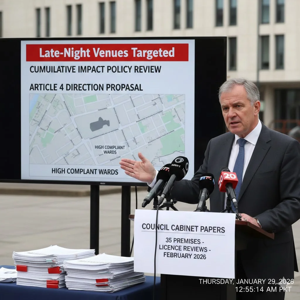 Council leader Councillor Jeremy Benstead announced January 23 Cumulative Impact Policy review targeting high complaint wards. Article 4 direction proposal removes planning permission automatic granting late-night venues within 200 metres residential boundaries. As documented in council cabinet papers, 35 premises face licence reviews February 2026 licensing sub-committee.
