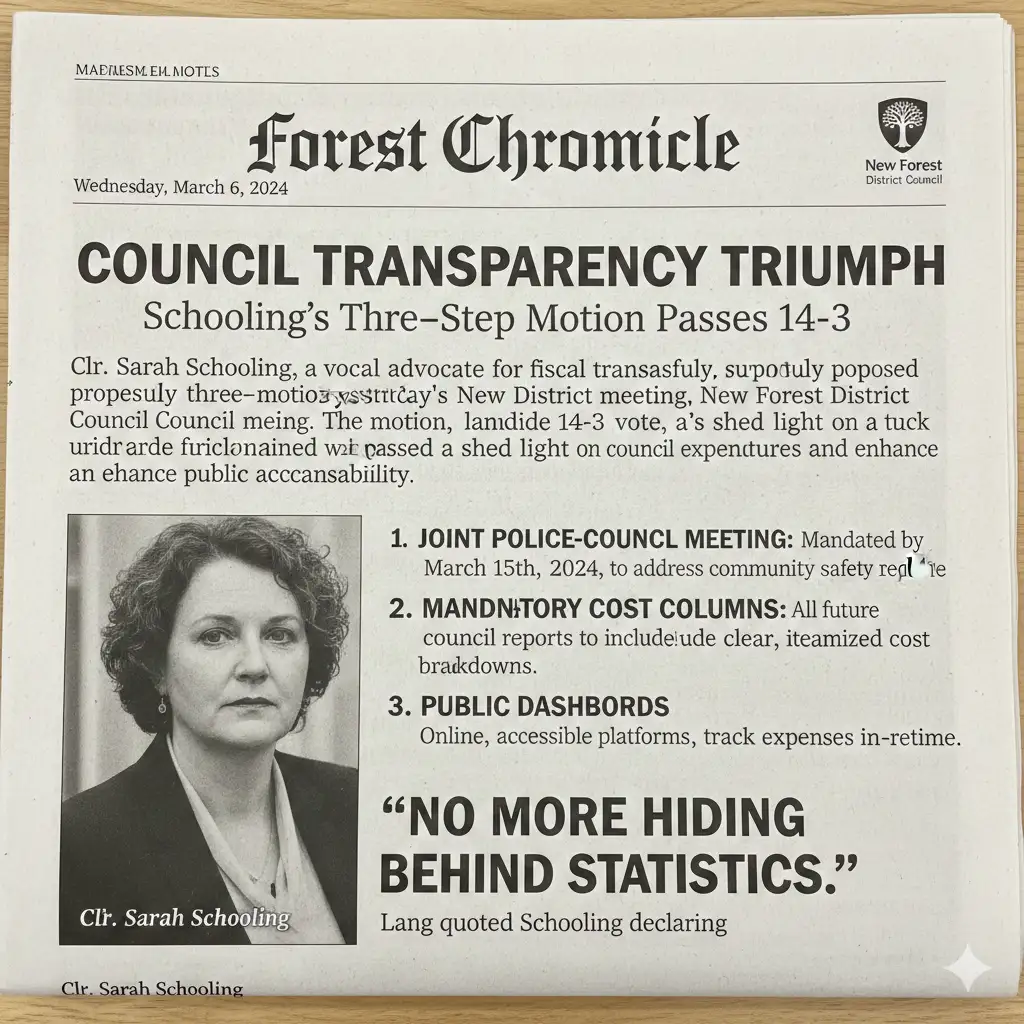 Schooling proposed three steps in her motion, which passed 14-3, as reported by New Forest District Council web editor Sophie Lang. First, a joint police-council meeting by 15 March; second, mandatory cost columns in all future reports; third, public dashboards tracking expenses. “No more hiding behind statistics,” Lang quoted her declaring.