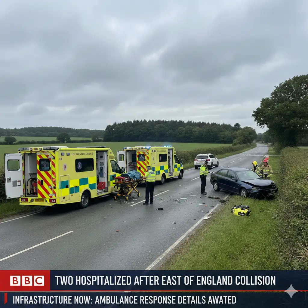 East of England Ambulance Service has not yet publicly released a detailed breakdown of the response, but both BBC News and Infrastructure Now state that two people were taken to hospital following the collision. No fire service statement has been quoted so far in the available reports, and it is not yet clear whether firefighters were required for extrication or vehicle safety following the impact.